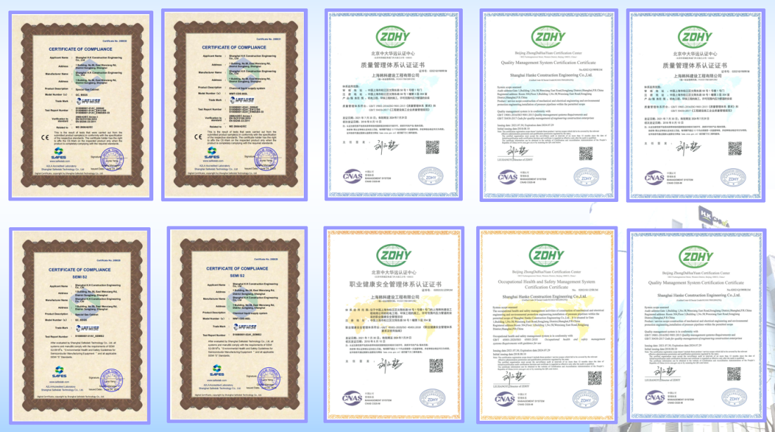 早在2012年到2017年间,公司先后取得建筑机电安装工程专业承包一级;机电工程施工总承包三级;电力工程施工总承包三级;建筑工程施工总承包三级;电子智能化工程专业承包二级;消防设施工程专业承包二级;环保工程专业承包三级;工程设计资质证书乙级;特种设备安;装改造维修许可证压力管道GC2等资质,逐步走上科学发展道路;2018年,通过了ISO9001质量管理、ISO45001职业健康安全管理、ISO24001环境管理体系等管理体系认证;2020年,获得GB/T50430工程建设施工企业质量管理规范、安全生产许可证、SEMIS2、CE等认证并于同年被评为国家高新技术企业,这些荣誉和成果,都让走上正轨的上海韩科在科技创新这条路上越走越实。